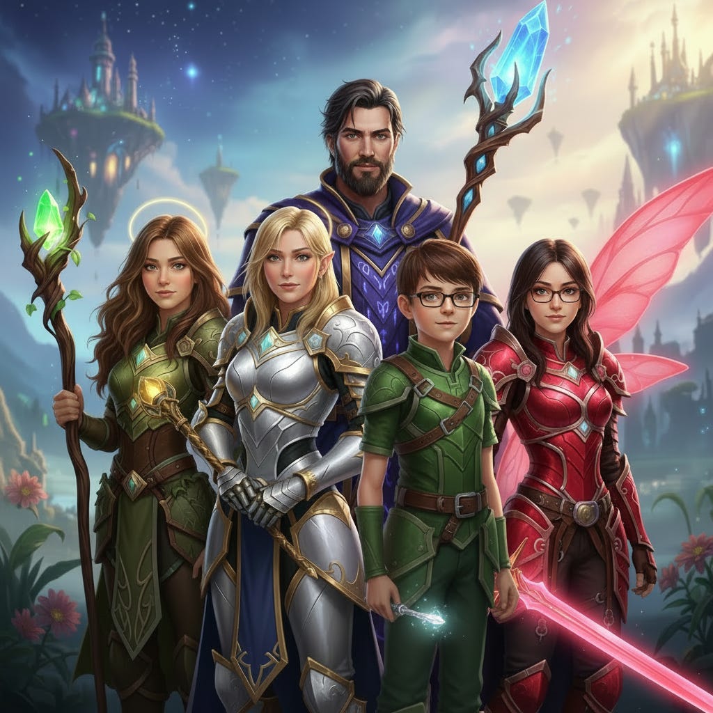 [The image above is where the slide went once it was real. Me as a mage. Her in silver armor. Three kids, each with their own class and powers. ]