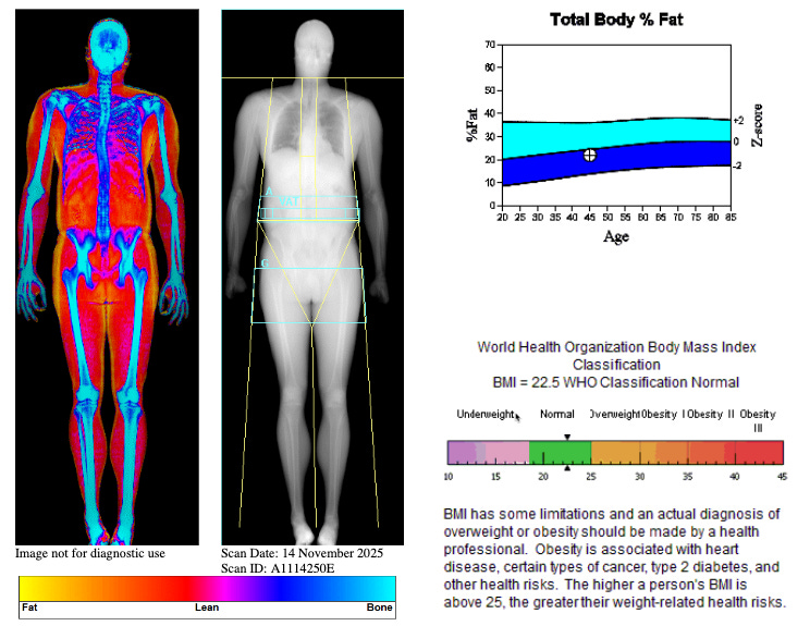 Visceral fat: 645g (slightly high—145g above average male…darn I gotta stop eating carbs again - being vegetarian is harder than carnivore!)