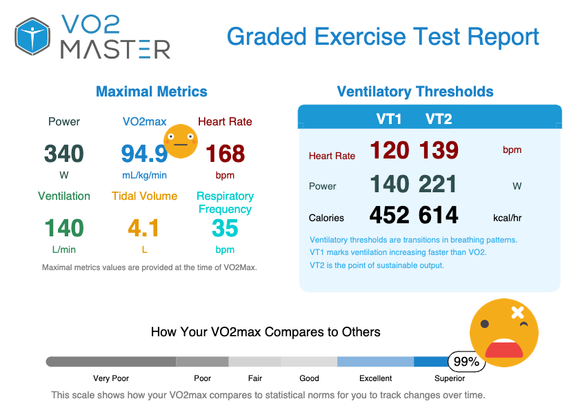 You’re on a stationary bike with a mask measuring every breath. Heart rate monitor. Power output tracked in real-time. They increase the resistance every few minutes until you physically can’t continue.